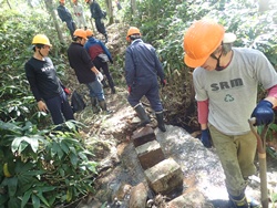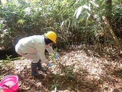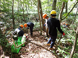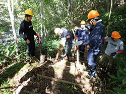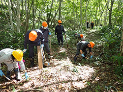 今日は足元からはじめる環境保全です。今回は、道具を持って、カマンぺツ木もれびの森フットパスの整備に出かけました。フットパスの散策路を歩きながら、点検していきます。散策路に落ちている落ち枝を拾ったり、ササを刈ったり、枯れ木や枯れ枝を切ったり。中には、大仕事もありました。先日の大雨で流されてしまった沢にかかるスラグの橋を持ち上げて直したり、崩れかかった階段を直したり、倒れた木をノコギリで切って整理したりと、集まったみなさんのパワーでどんどんフットパスが整備されていきました!ひと汗かいた後には、美味しい具沢山そうめんが待っていました!