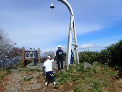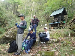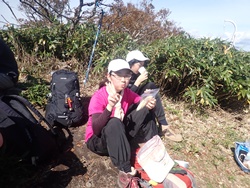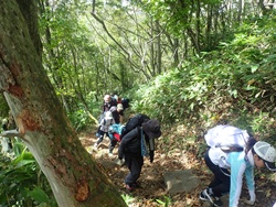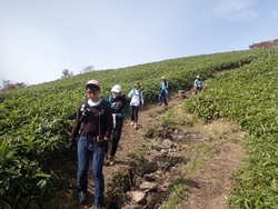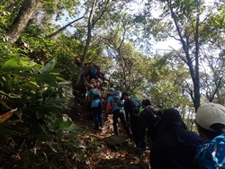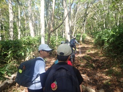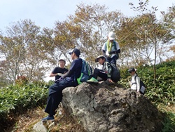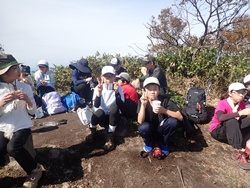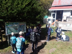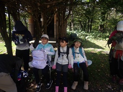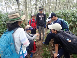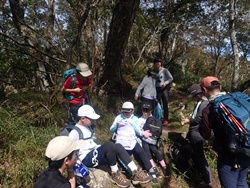 今日のミッションは、頂上でお湯を沸かしておやつラーメンを食べる!です。みんなで共同装備を分担し、荷物を確認し、準備体操をして登山を始めました。