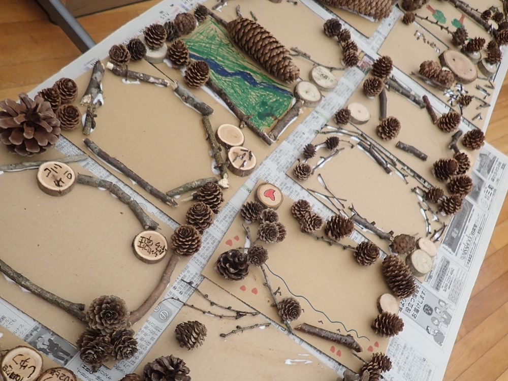 後半は、木のぶんぶんゴマづくりをしました。輪切りにしてある木の中心にキリで2つの穴をあけてタコ糸を通して遊びました。