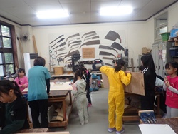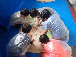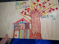 ながぐつレンジャーは、ちいさな森のおうちの屋根のペンキ塗り。まずは、屋根裏になる場所に鉱山の森をイメージした絵を描いていきます。動物や森など、ながぐつレンジャーの持ち味を生かした素敵な作品に仕上がっていきました。屋根のペンキ塗りは、お昼を食べた後に引き続き行い、真っ赤な屋根が仕上がりました!