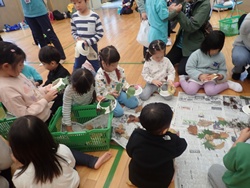 その後は、森のようちえん、ながぐつレンジャー、山の学校、保護者の大人プログラムに分かれて、それぞれ活動しました。森のようちえんでは、のびのびコースともりもりコースに分かれて秋の恵み探し。きれいに色づいた落ち葉やお気に入りの秋を見つけて、飾りを作りました!