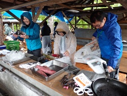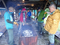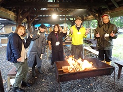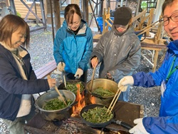 保護者向けの大人プログラムでは、豚汁作り、おやつ焼き芋作り、薪割り、焚き火に挑戦!焼き芋の準備をして熾火でじっくり焼き芋を焼いたり、薪割りから、焚き火、そして、おまけの熊笹茶づくりへなど、一つだけでなく、みんなで協力しながら楽しく活動を行いました。