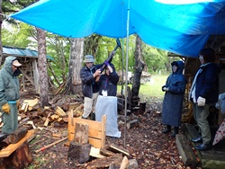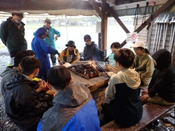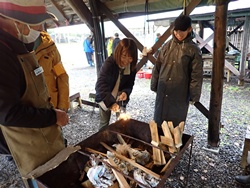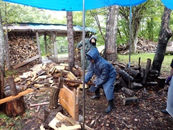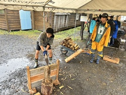 山の学校では、薪割りと焚き火に挑戦しました。まさかりを使って、大きな丸太を割ったり、ファイヤースターターを使って、火付のタイムトライヤルにチャレンジしたり。割った薪を使ってたき火も行いました。