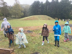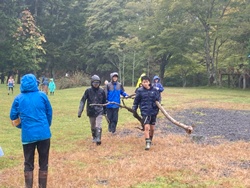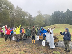 まずは、森のようちえんの準備体操「どんどこどん〜♪森の中で遊ぼうよ!」と体を動かしました。そして、雨にも負けず、カッパを着て、雨の中の落ち枝広い。落ちている枝を拾って、焚き火用の焚き付けを集めました。