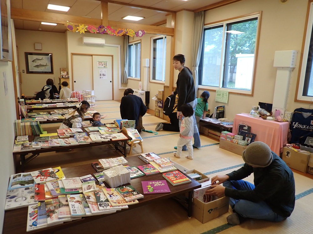 今日は子育てフェスに合わせて、森ぶっく古本市が行われました!皆さんからご寄付いただいた古本をラインナップ。とてもとても大盛況でした。絵本や雑誌など、皆さんお気に入りの本を見つけていました。