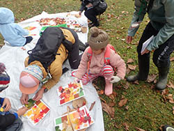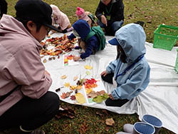 今日は、森のカラーハンター 秋の色を探そう!を行いました。親子4組13名のみなさんが、秋の森の中を歩き、秋の色を探しました。まず、参加者のみなさんの好きな色とその理由を発表し、森に出発しました。里の川では、拾った落ち葉で色や形の違いを楽しみながら、秋のグラデーションカードと落ち葉で作ったガーランドを制作しました。紅葉のしくみや動物の色の見え方の違いなど、クイズ形式で学びました。