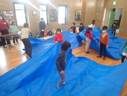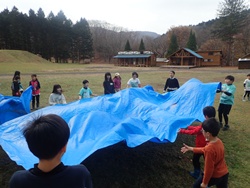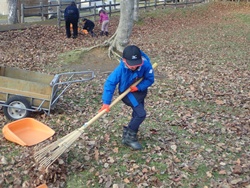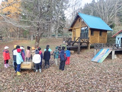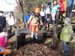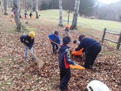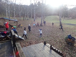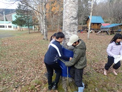 残りの時間には、冬に向けた作業も行いました。高学年は木に「そりぶつかり防止マット」を巻き、低学年は落ち葉集めを担当。作業後には、集めた落ち葉に飛び込んだり、みんなで鬼ごっこをしたりして楽しく過ごしました。