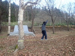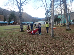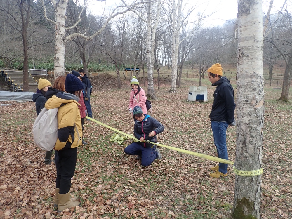 今日は、デイキャンプ研修ということで、ハンモック、スラックラインの設置方法や安全確認、たき火の研修を行いました。