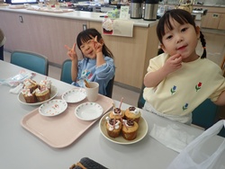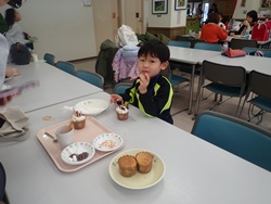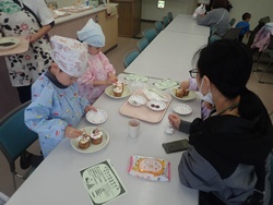 午前中は、ダッチオーブンでカップケーキを焼いて、クリスマスケーキを作りました。フワフワに膨らんだ上に生クリームやチョコレート、もみの木をイメージした抹茶クリームなど、それぞれでデコレーションを楽しんでいただきました。