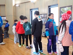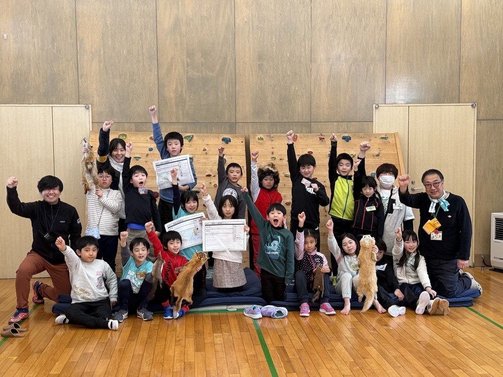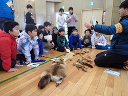 はじめに、鉱山で見られる動物について学ぶ活動として、ネイチャーゲーム「私は誰でしょう」を実施しました。その後、実際の動物の毛皮を見ながら、足跡の特徴や見分け方について話をしました。