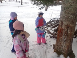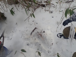 ③の班はテンの足跡を追い、GPSを使って歩いたルートを地図に記録しました。足跡をたどっていくと、険しい坂道もあり、最終的にはコーザンピーク(ふぉれすと鉱山遊歩道で最も高い場所)まで登りました。途中でネズミやシカの足跡を見つけた班もありました。