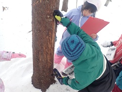 ②の班はトドマツ林内でシカの角とぎ跡を調査しました。調べた93本の樹木のうち、43本に角とぎ跡が確認されました。