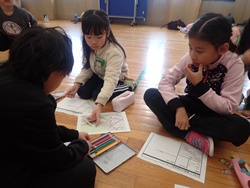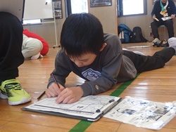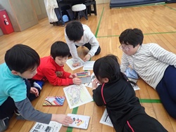 昼食後は、調査内容のまとめ作業を行いました。調べた足跡や発見したことを、絵や文章で表現し、ミッションごとにA3サイズの紙にまとめました。わかったことや気づいたことをイラストや装飾で工夫しながら仕上げました。