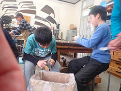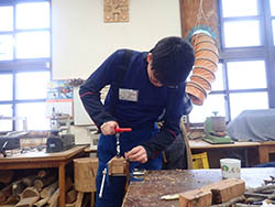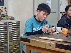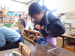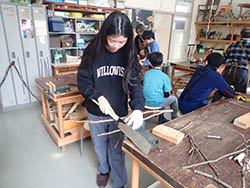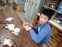 木工室に持ち帰ってきて、まずは、小刀を使って、木の鉛筆削りで小刀の使い方のトレーニング。最初はぎこちない使い方でしたが、どんどん上手くなっていきました。そして、お気に入りの枝を切り出し、ドリルで穴を開けて、ボールペンの芯を入れる作業を行いました。そこからオリジナルのペンにするために削ったり磨いたり。そして、ペンたても作りました。