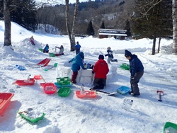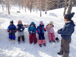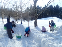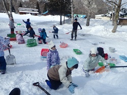 道具を準備し、もんきーパークで活動開始。買い物かごに雪を入れてブロックを作ったり、雪山を掘ったりと、2チームに分かれて作業を進めました。かまくらチームに続いて、すべり台づくりのチームも発足。雪だるまとすべり台も作り始めました。