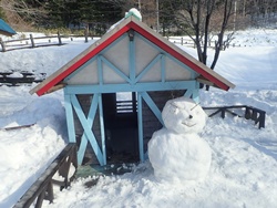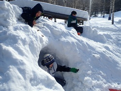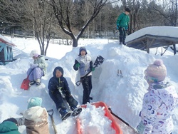 お昼はてらこやで食べ、午後も引き続き遊び場づくり。雪だるまには顔がつき、すべり台には階段が完成。かまくらには耳と顔がつき、イスには背もたれがつきました。