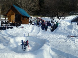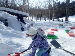 今日は、明日のプログラム「森のようちえん」の参加者に楽しんでもらえるよう、雪の遊び場づくりを行いました。