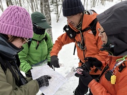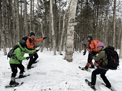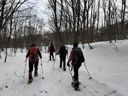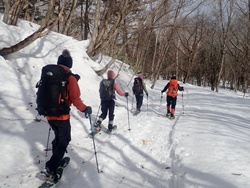 三来馬スキー場から入山し、スノーシュートレッキングで目的地を目指しました。先週から気温が高かった影響もあり、下見の時と比べて雪がやや減っている様子でした。