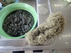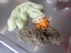 セイタカアワダチソウやミカンの皮で糸をそめました。淡いグリーンや少し濃い目のグリーンなど春らしい色に染まりました。