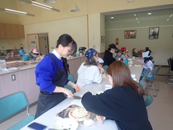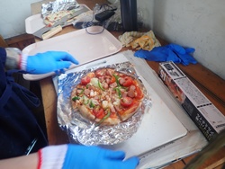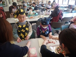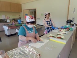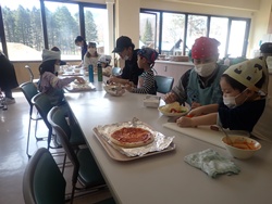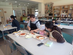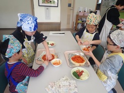 参加者のみなさんには、ピザ生地にトマトソースを広げ、玉ねぎやピーマン、トマトなどお好みの具材をトッピングしていただきました。
