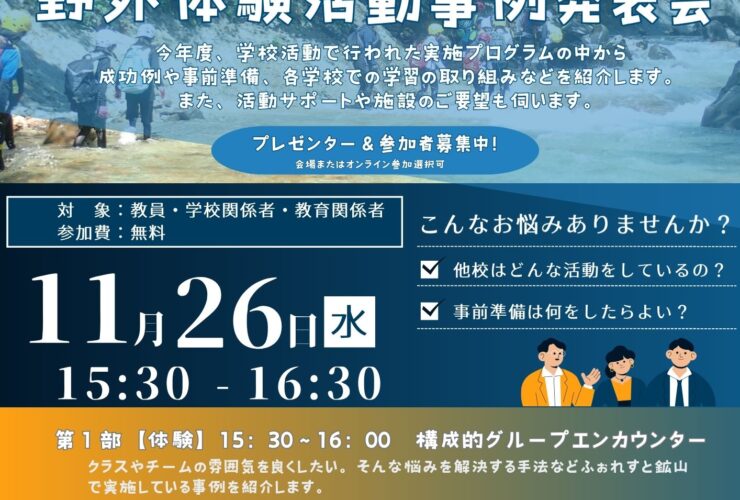 対象 自然体験活動に興味のある大人の方・教職員の方も大歓迎