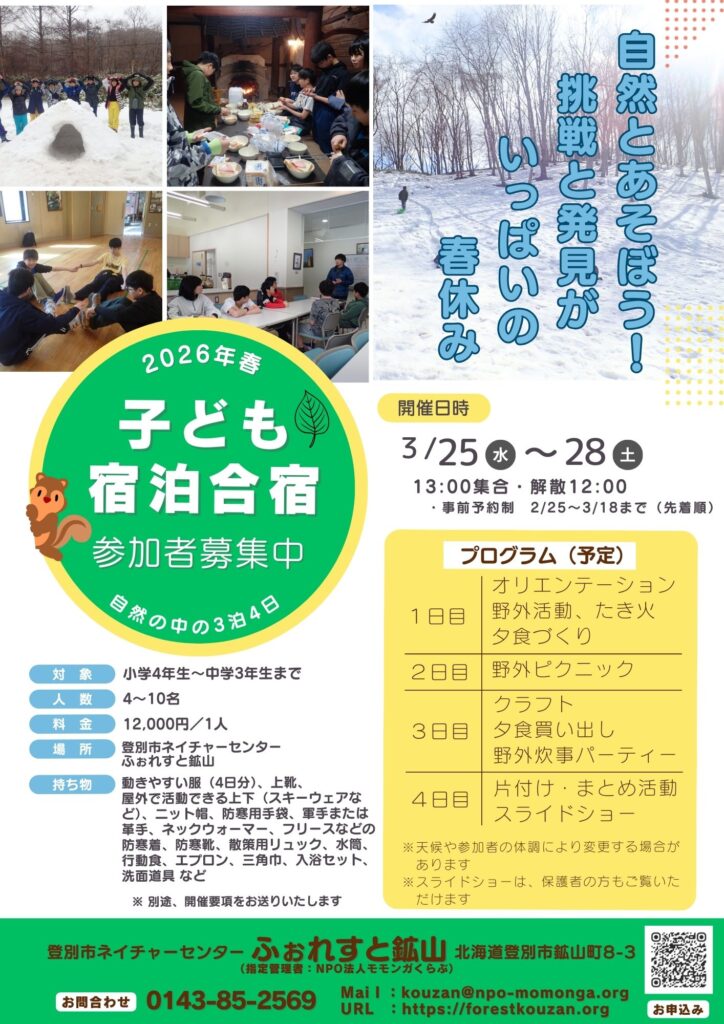 内容 自然体験活動を通して、自然の中で子ども達が協力しながら3泊4日を過ごします。(2026子ども宿泊合宿PDF)