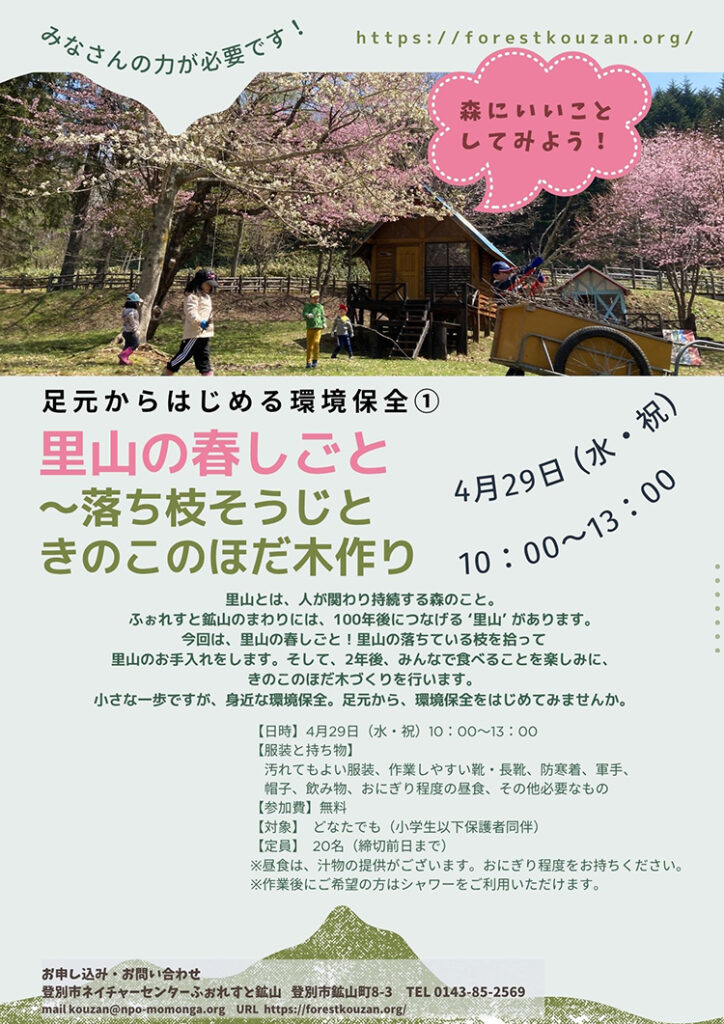 内容 ふぉれすと鉱山周辺を歩いてごみ拾いと、きのこのほだ木づくり