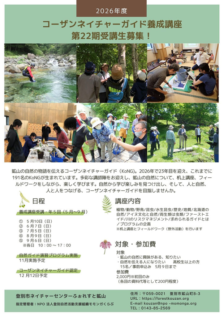 内容 鉱山の自然を案内するコーザンネイチャーガイド。第1回目の講座は、「ガイドとは」「植物」「アイヌ文化と自然」です。