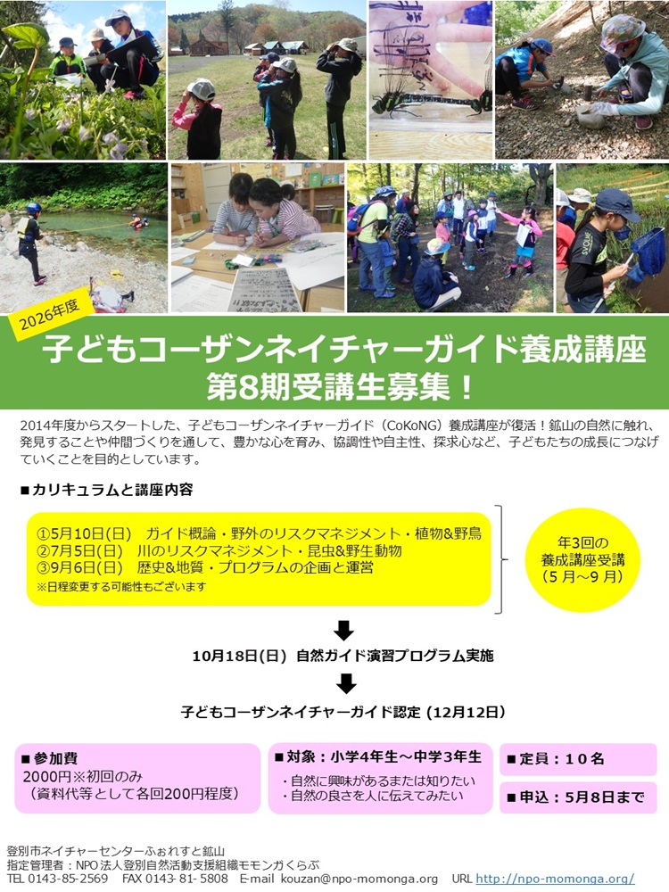 備考 予定:年3回の養成講座受講(5~9月)・10月18日自然ガイド演習プログラム実施・12月7日子どもコーザンネイチャーガイド認定式