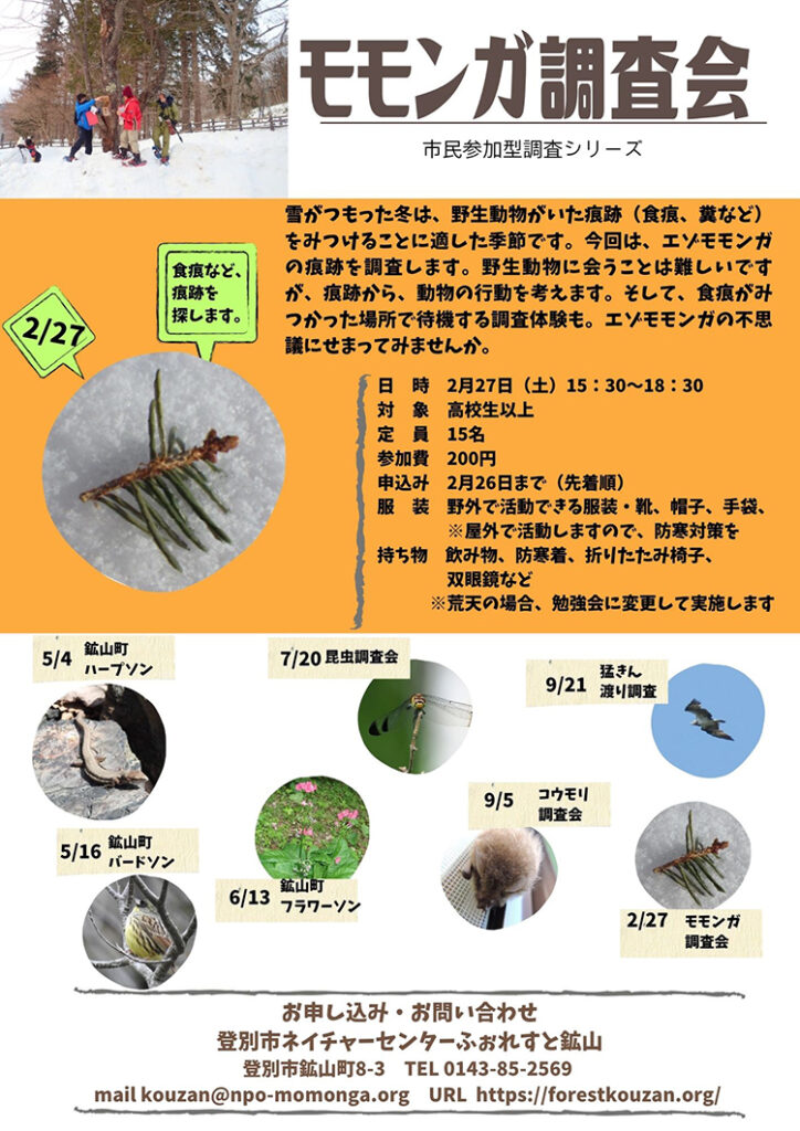 持ち物:野外で活動できる服装、帽子、防寒着、防寒靴、手袋、飲み物、あれば折りたたみ椅子や双眼鏡などその他必要なもの